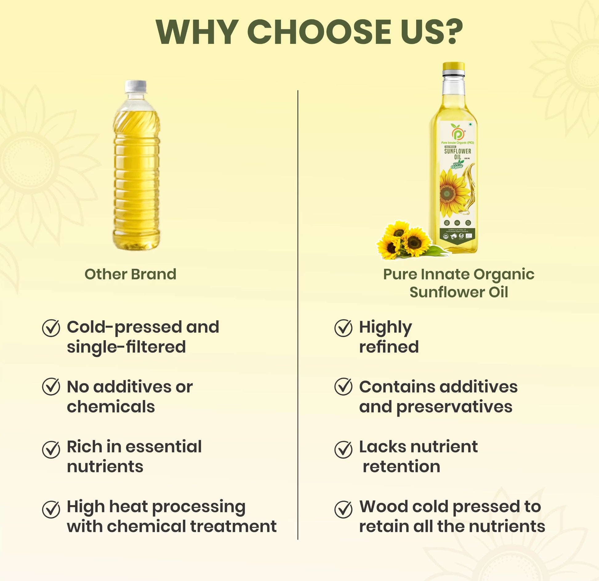 Sunflower Oil is a light, natural oil extracted from sunflower seeds, prized for its high smoke point and mild flavor. Rich in vitamin E and low in saturated fats, it supports heart health and maintains nutritional integrity during cooking. Ideal for frying, baking, and salad dressings, this oil delivers a healthy option without compromising taste or quality.